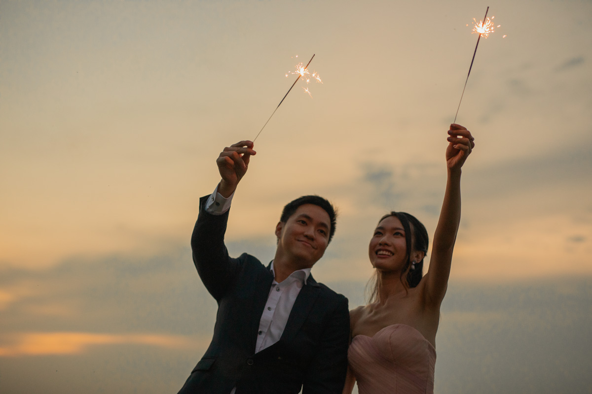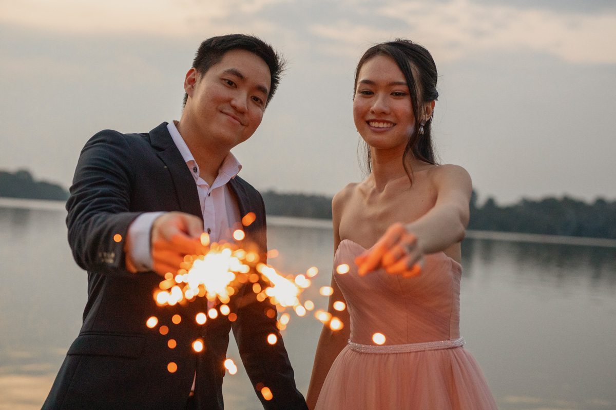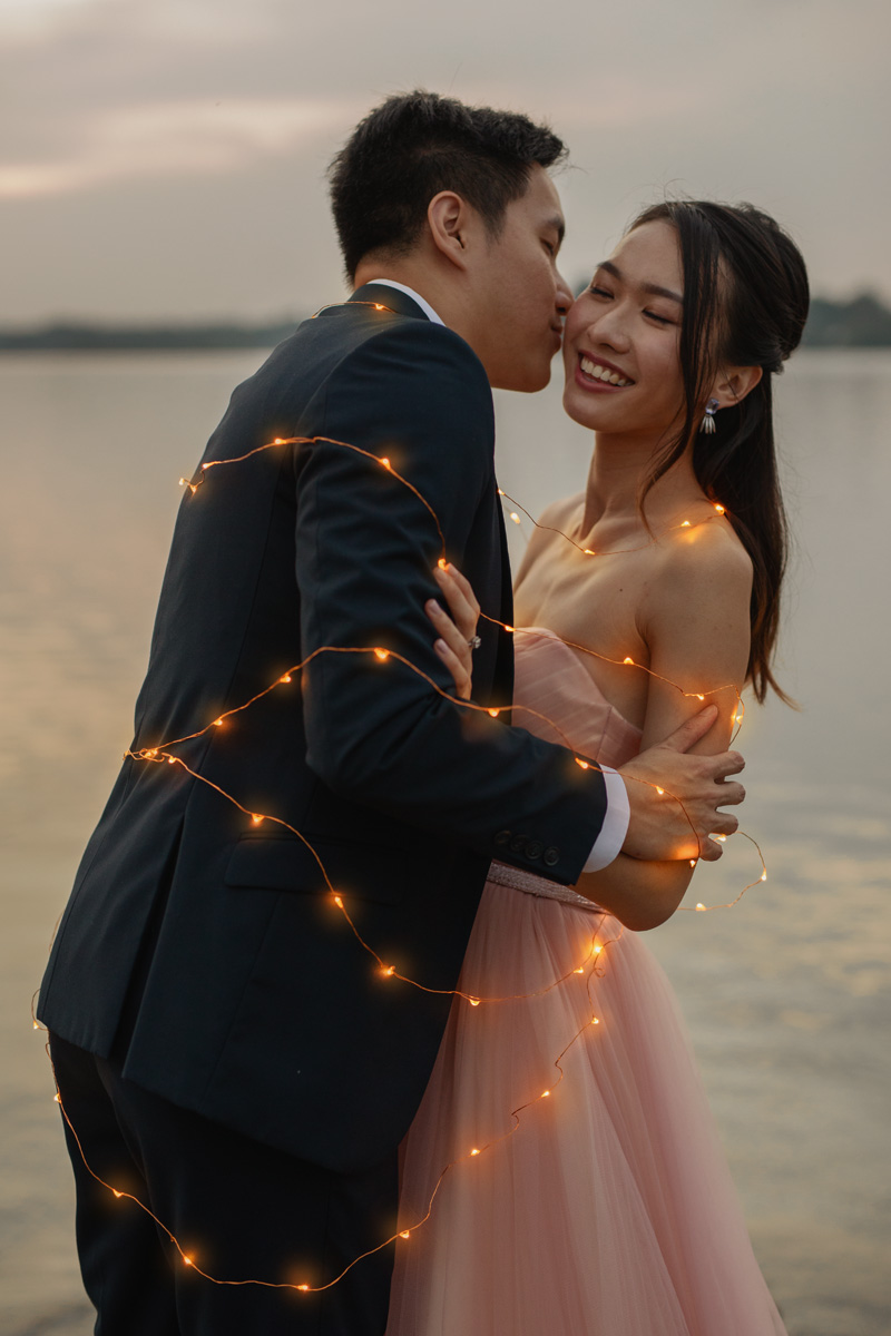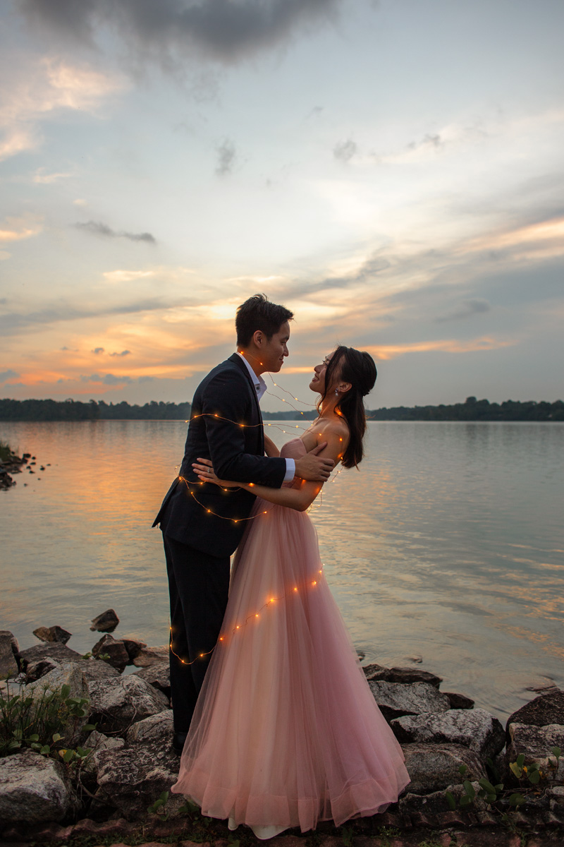 As the sun gradually set closer and closer to the horizon, daylight was diminishing fast, and soon dusk fell. We brought a couple of props to sprinkle in some fun for this prewedding shoot. Firstly, we had our sparklers. With the dazzling sparklers, the couple was like embracing their inner child and having so much fun playing. Right before them, I captured their love that is shining as bright as the sparklers. Secondly, we brought the popular fairy lights. Fairy lights exude a classy vibe, which creates the perfect opportunity to capture captivatingly extraordinary moments. The result is a romantic touch that leaves the photos looking magical.