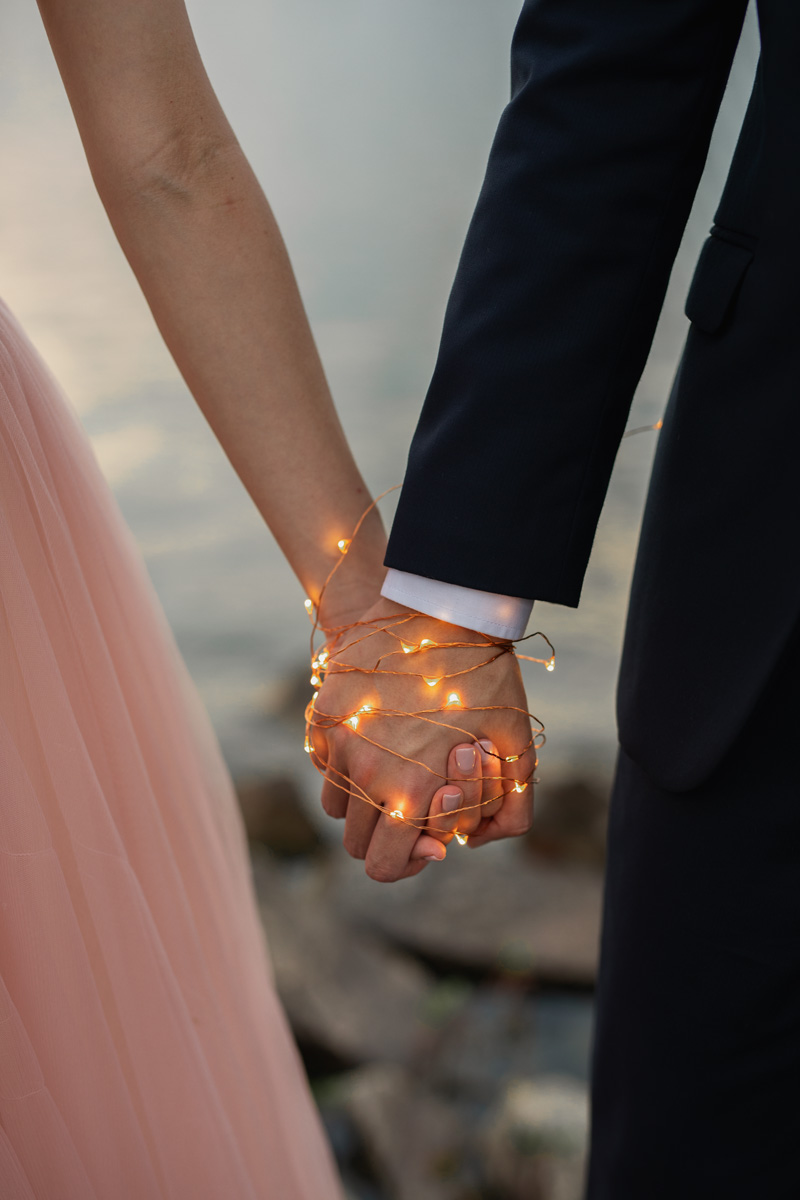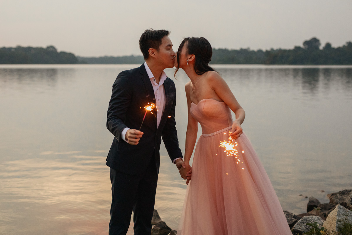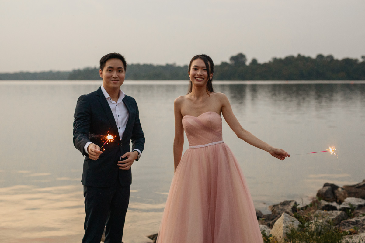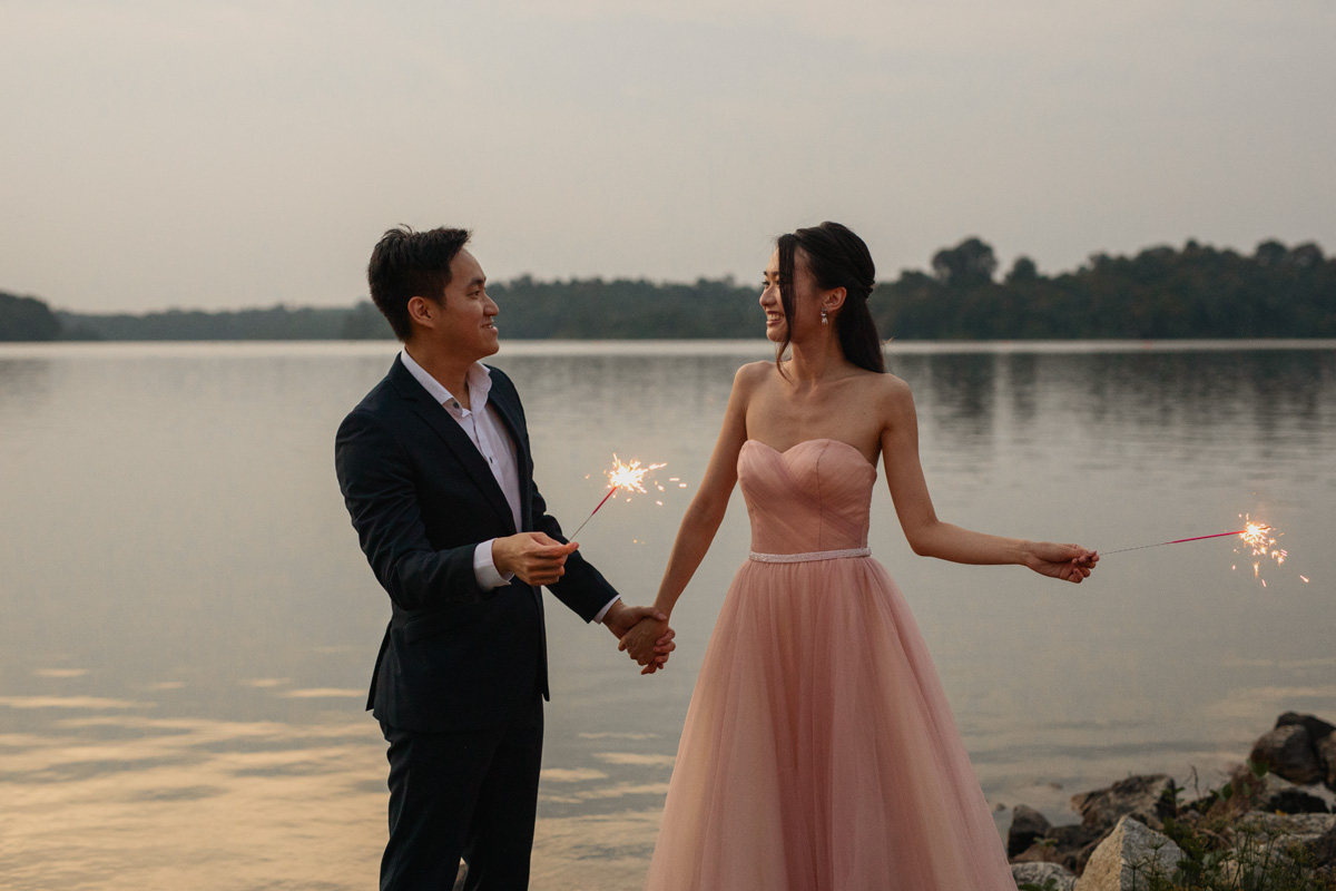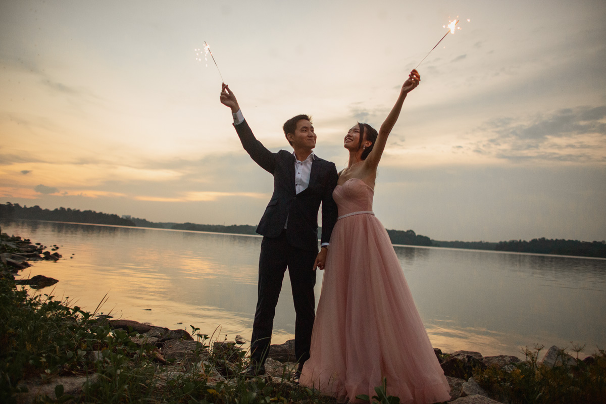 As the sun gradually set closer and closer to the horizon, daylight was diminishing fast, and soon dusk fell. We brought a couple of props to sprinkle in some fun for this prewedding shoot. Firstly, we had our sparklers. With the dazzling sparklers, the couple was like embracing their inner child and having so much fun playing. Right before them, I captured their love that is shining as bright as the sparklers. Secondly, we brought the popular fairy lights. Fairy lights exude a classy vibe, which creates the perfect opportunity to capture captivatingly extraordinary moments. The result is a romantic touch that leaves the photos looking magical.